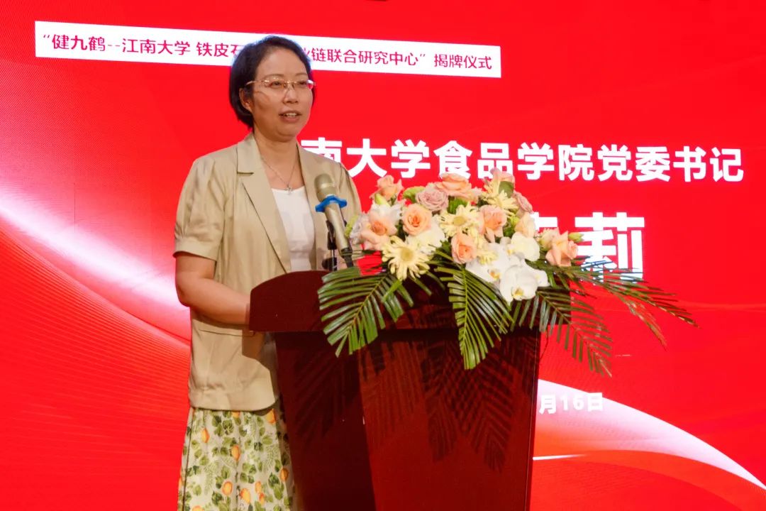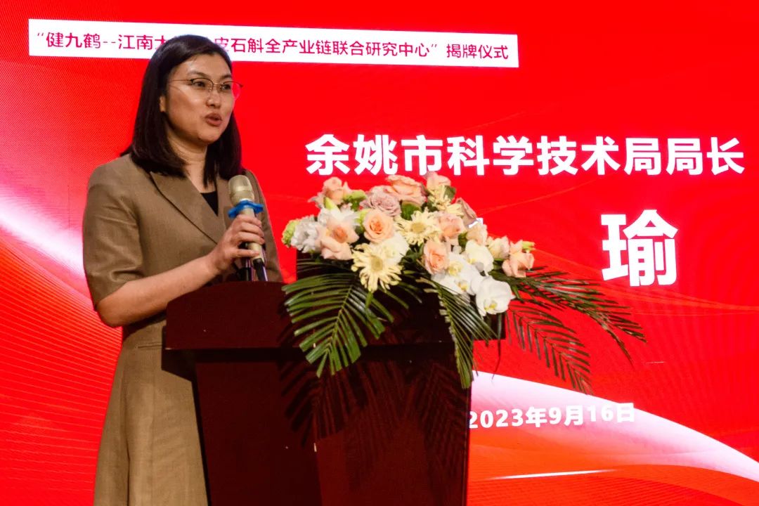 余姚市科学技术局局长苏瑜强调了科技创新的重要性、肯定了健九鹤自成立以来取得的成绩、对江南大学的支持表示感谢,对双方合作充满信心。