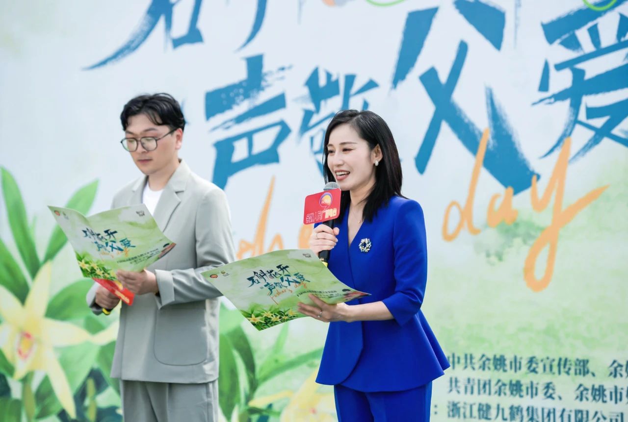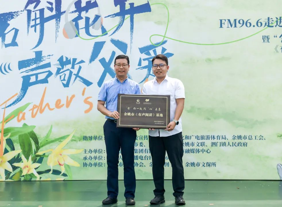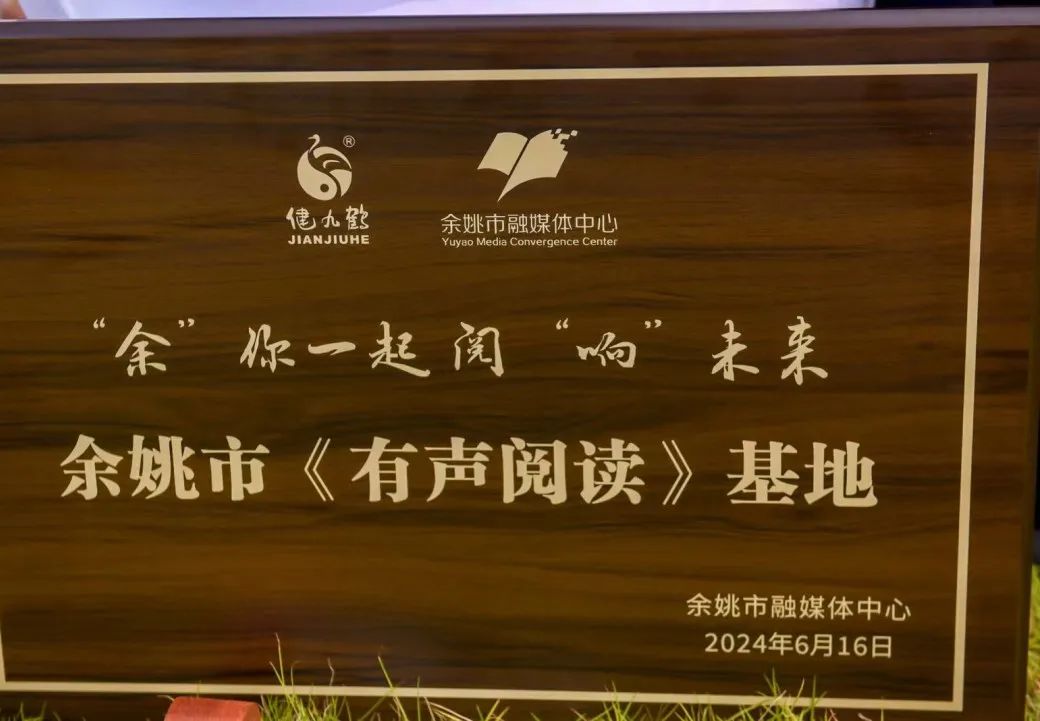余姚市融媒体中心主任、党委书记马金浩为健九鹤集团总经理戚勇颁授“声动九鹤”有声阅读基地牌匾,健九鹤成为余姚市首个有声阅读基地。