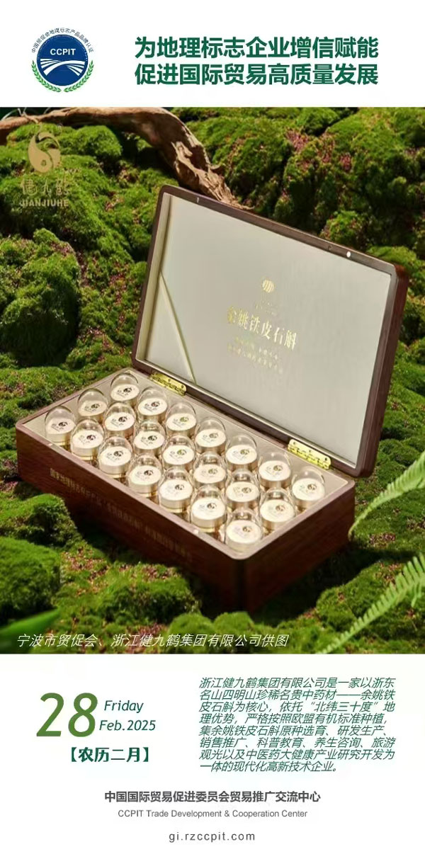 发布时间:2025-03-24 点击量:309中国贸促会正式授权我会开展地理标志产品品牌证明书业务,此举标志着我会成为浙江省首批具备开展地理标志产品品牌证明书业务的机构之一。浙江健九鹤集团有限公司的“余姚铁皮石斛”产品获我省首份《地理标志产品品牌证明书》。地理标志是重要的知识产权类型,是促进区域特色经济发展的有效载体,也是国际贸易中产品的“经济护照”。地理标志产品品牌证明书是基于国际规则和贸易管理,由中国贸促会及其授权的分支机构签发,对核准使用地理标志专用标志的市场主体从品牌运营、地理标志使用、质量管理、可持续发展等指标进行评价,“优中选优”,对符合条件的企业出具证明书,填补了我国地理标志产品品牌国际化建设空白。浙江健九鹤集团有限公司是一家以浙东名山四明山珍稀名贵中药材——余姚铁皮石斛为核心,以新质生产力发展为引擎,深耕发展大健康产业的公司。该公司依托“北纬三十度”地理优势,打造“铁皮石斛+”产品生态圈,守护余姚铁皮石斛国家地理标志,引领中国铁皮石斛产业健康发展。“使用地理标志产品品牌证明书,相当于为地理标志产品企业建立了一套规范、合理的运营标准和制度。”公司负责人表示,运用该证书,企业可持续提高国内外市场认可度,增强产品溢价能力。宁波市贸促会将以此为契机,积极面向我市企业及对口商协会宣传推广地理标志产品品牌证明书,鼓励我市企业充分利用地理标志产品品牌证明书推进区域特色产业发展,进一步畅通国际贸易合作。