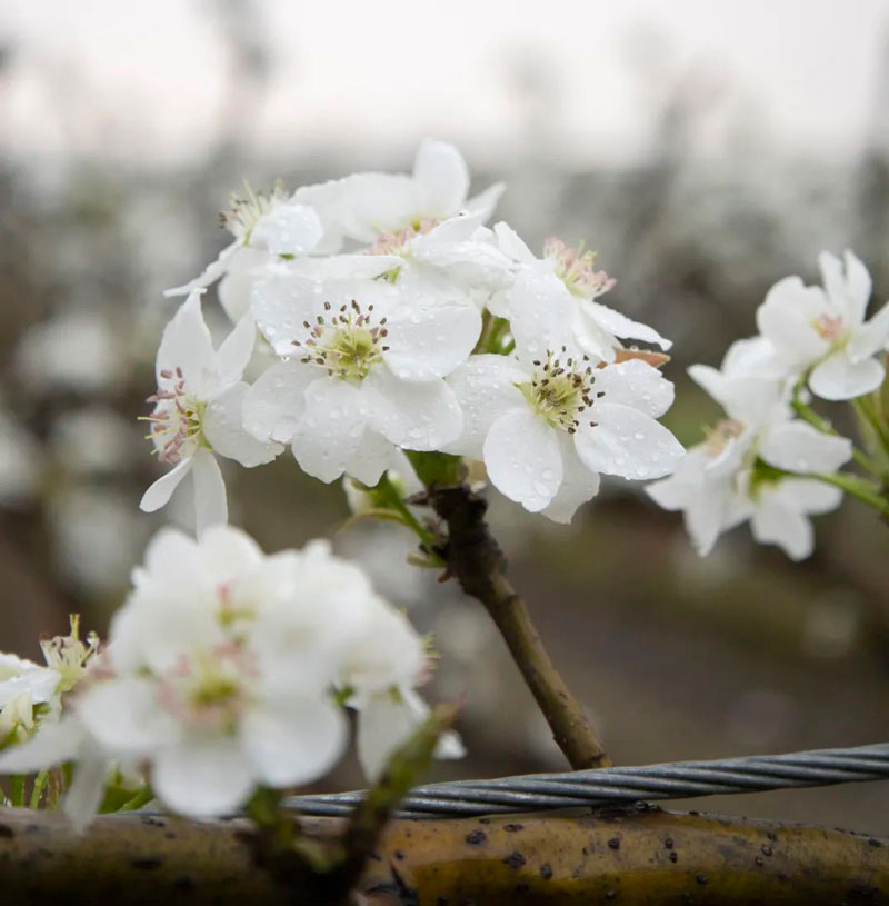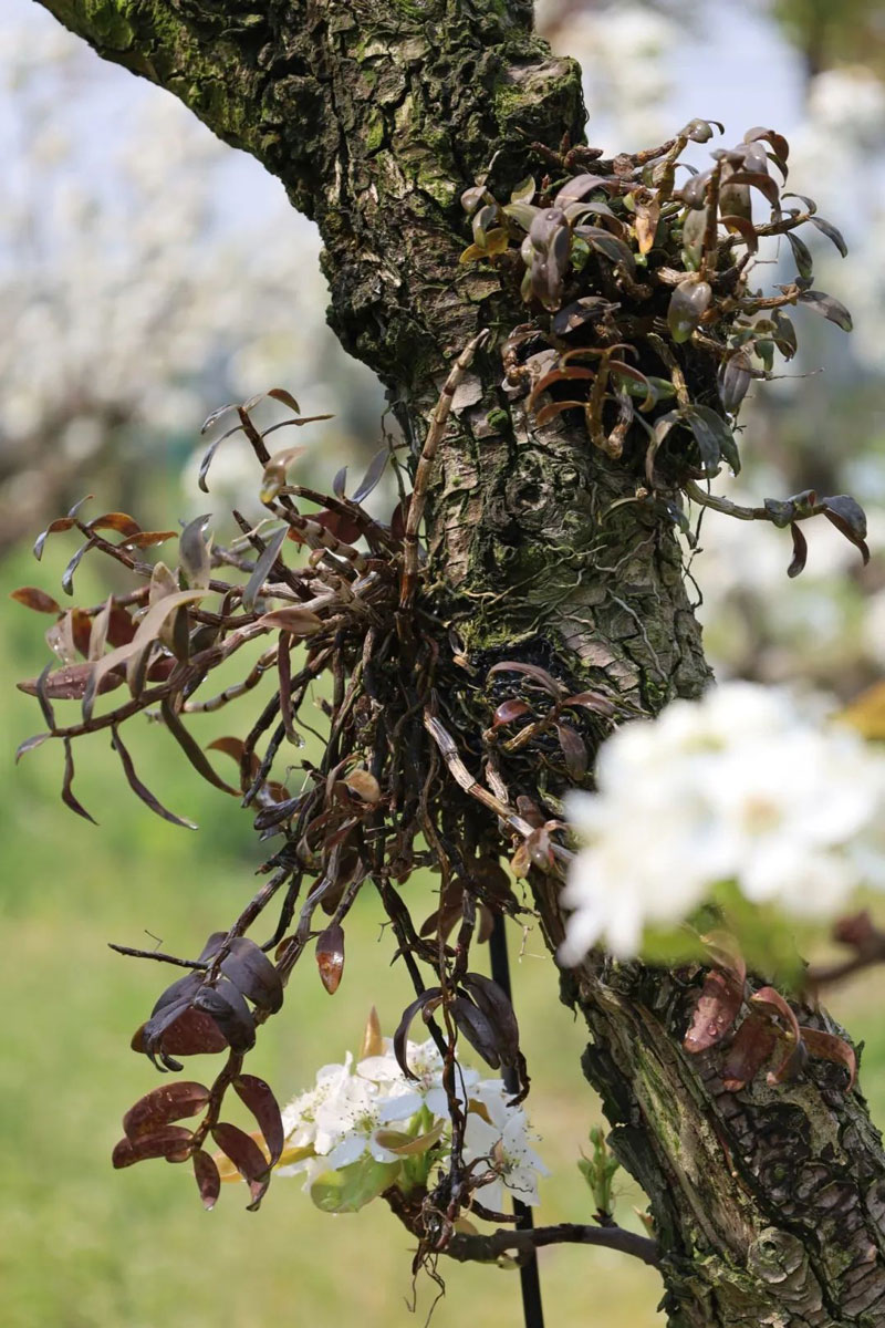 当健九鹤生态梨园内的梨树抖落最后一丝春寒,百亩梨树次第苏醒,嫩白花瓣如新雪压枝,却在层层叠叠的枝桠间,隐约可见铁皮石斛的茎叶缠绕生长。
