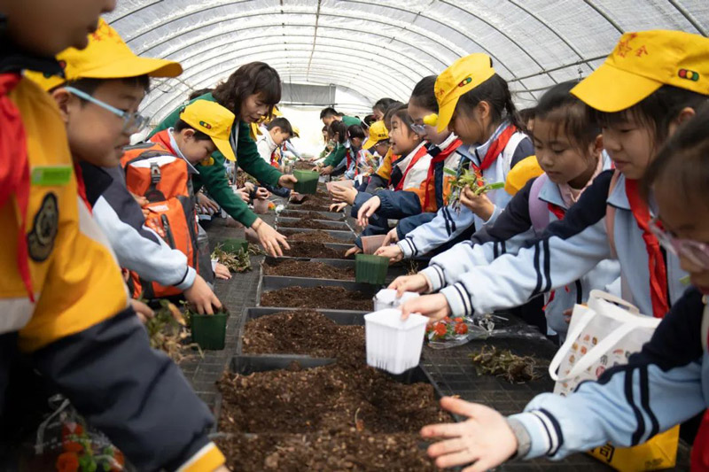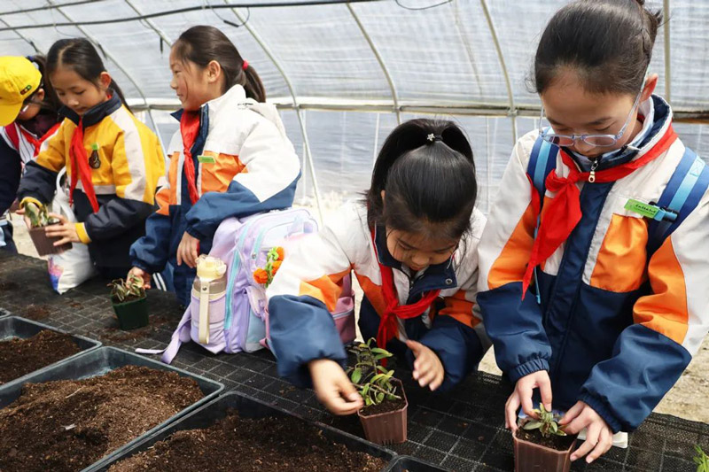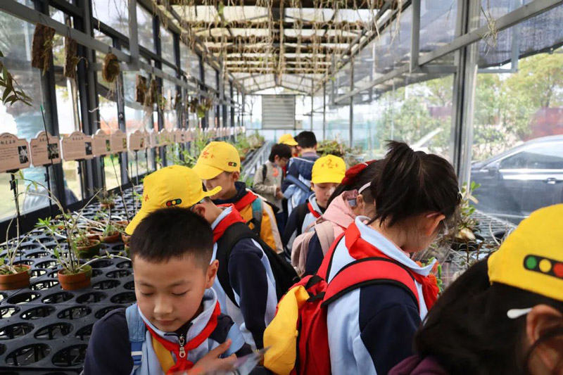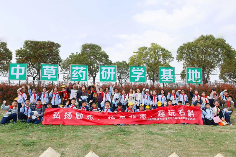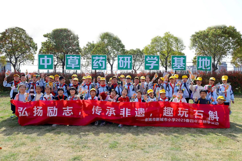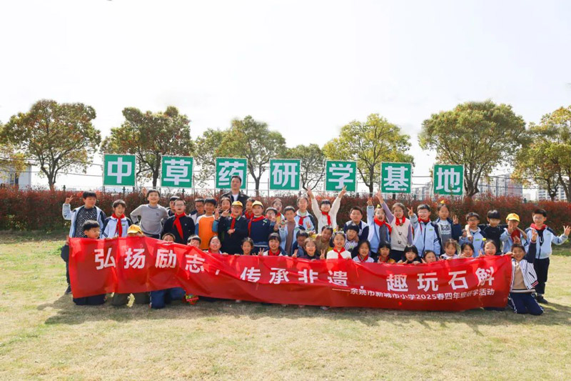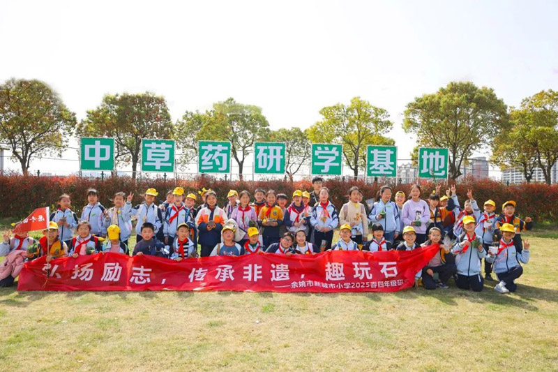 发布时间:2025-04-12 点击量:2984月1日,浙江韵芝堂中草药研学基地迎来了一群特殊的访客——余姚市新城市小学的师生们,在春意盎然的季节里开启了一场别开生面的文化探索之旅。这场以"弘扬励志·传承非遗·趣玩石斛"为主题的研学活动,将传统文化浸润与趣味实践创新完美融合,为青少年搭建起认知中华医药文明的立体课堂。