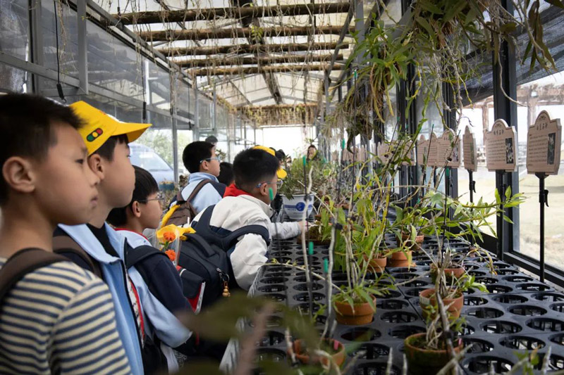 占地1250亩的研学基地宛如天然药典,三十度基地内铁皮石斛舒展青翠枝叶,百草园内百草生机盎然,盆栽制作棚飘散着草木清香。
