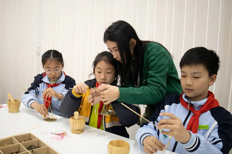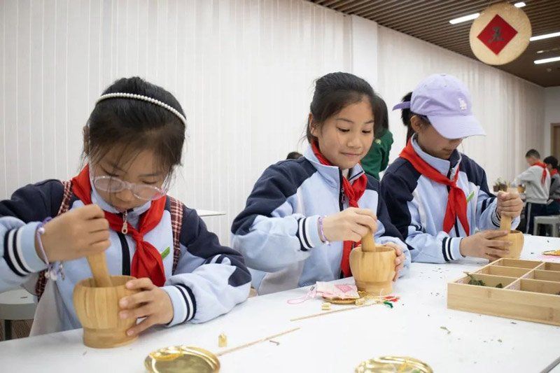 在"捣药小药童"实践环节,孩子们手持戥秤的专注模样宛如穿越时空的小药童。0.5克薄荷、1.2克丁香,精确到毫厘的称量中渗透着"炮制虽繁必不敢省人工"的匠心理念。当亲手制作的驱蚊香囊泛起幽幽药香,劳动教育的真谛在指尖流淌。