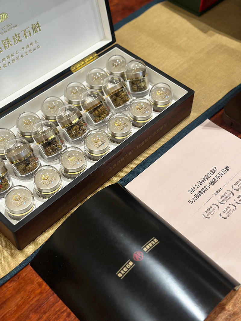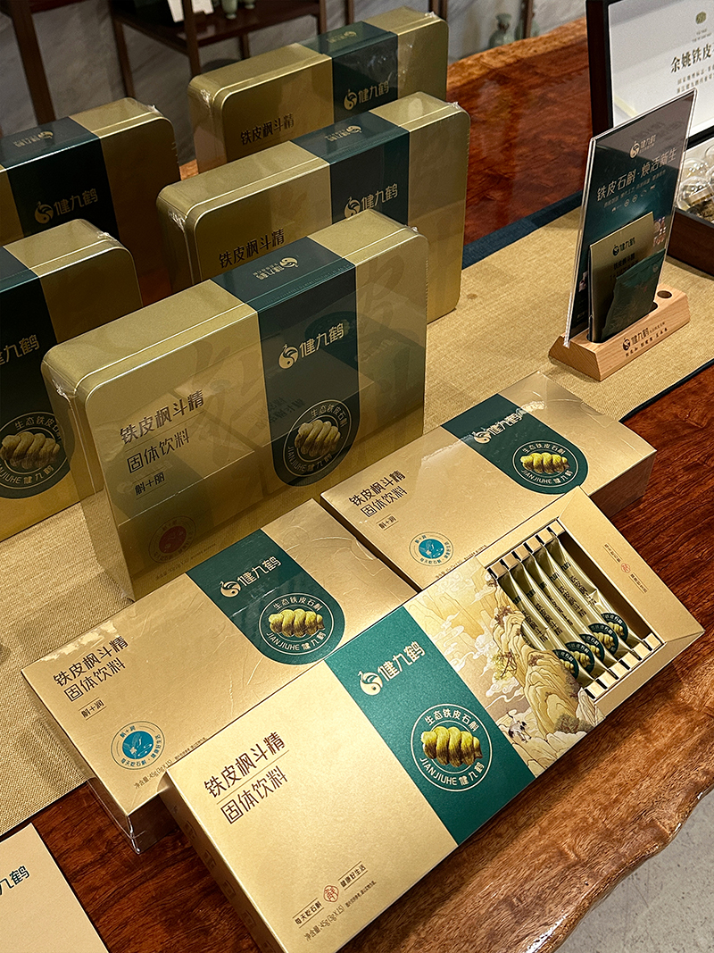 全新升级的铁皮枫斗精固体饮料也在此次摆场中全新亮相。产品包装采用了沉稳而高贵的金色系搭配清新的绿色,盒身上的图案充满传统韵味,展现着铁皮石斛的独特魅力。健九鹤甄选优质的生态铁皮石斛为原料 ,通过传统智慧与现代工艺的完美融合,将铁皮石斛的精华浓缩在这小小的一包固体饮料中。对于经常出差、生活节奏快的商务旅客而言,它是便捷又高效的养生佳品,随时随地,都能为身体注入活力,焕活新生。