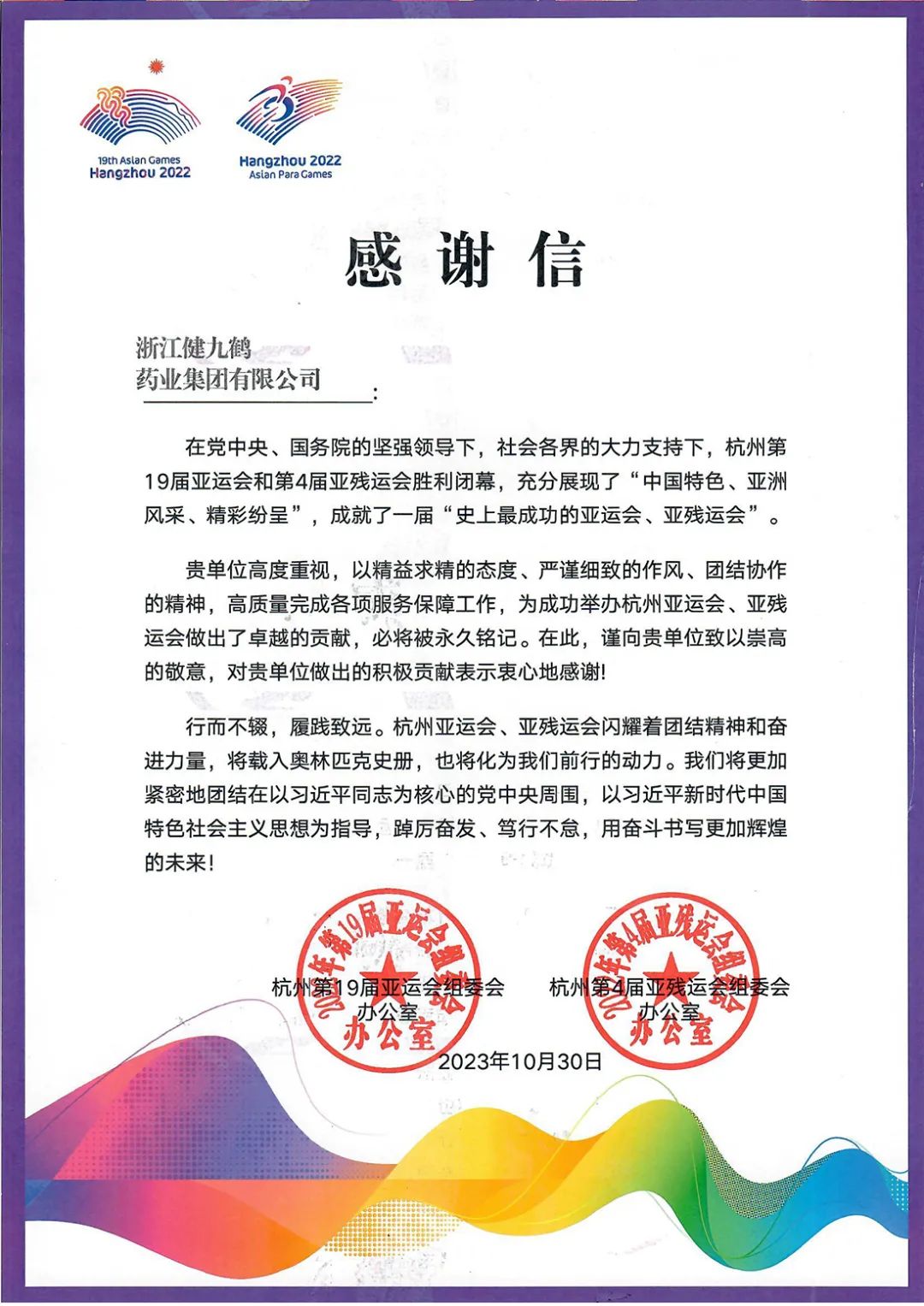 一封来自杭州亚组委的感谢信
