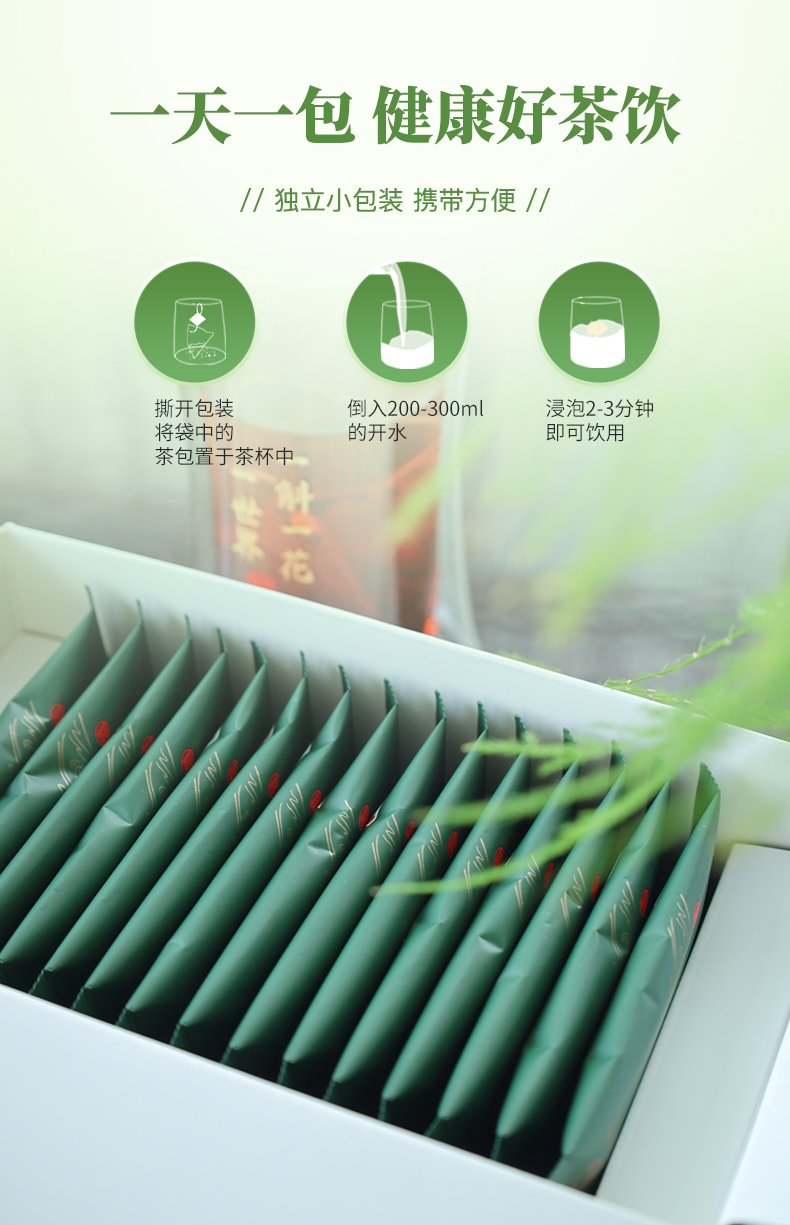 食用方法:取1袋放入杯中,加入200-300ML开水,浸泡2-3分钟即可饮用,可冲泡数次。