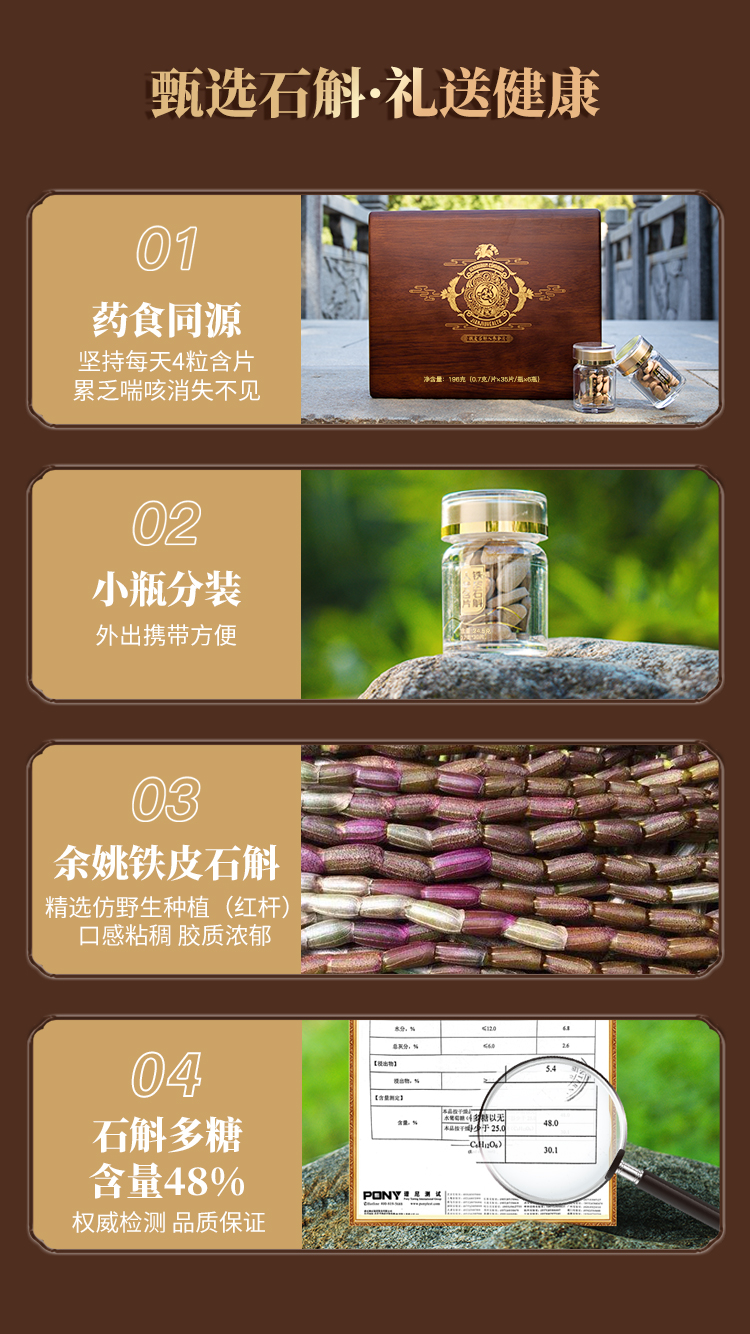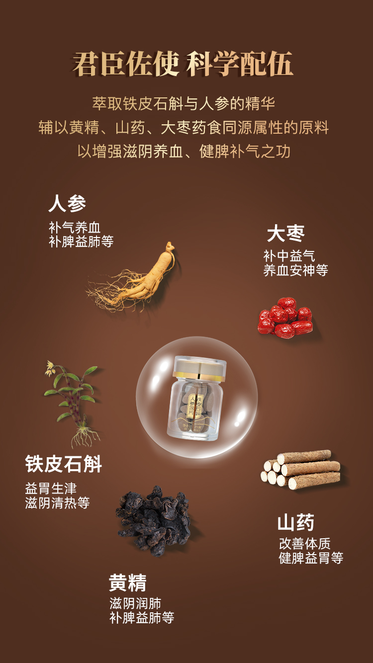 配料:麦芽糊精,铁皮石斛花提取物,人参提取物(5年及5年以下人工种植),黄精提取物,山药提取物,大枣提取物,罗汉果甜苷,硬脂酸镁,薄膜包衣粉(聚乙烯醇,聚乙二醇)