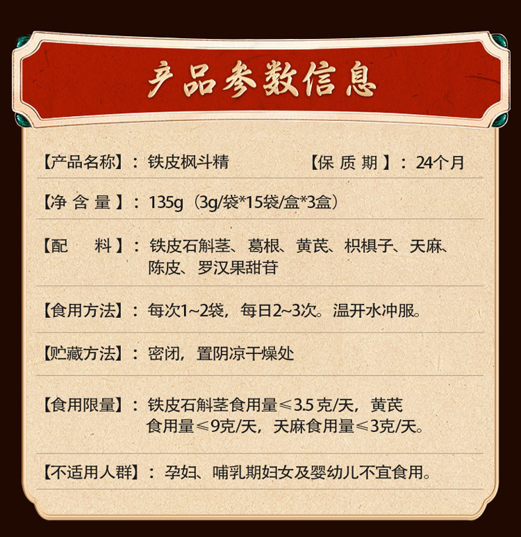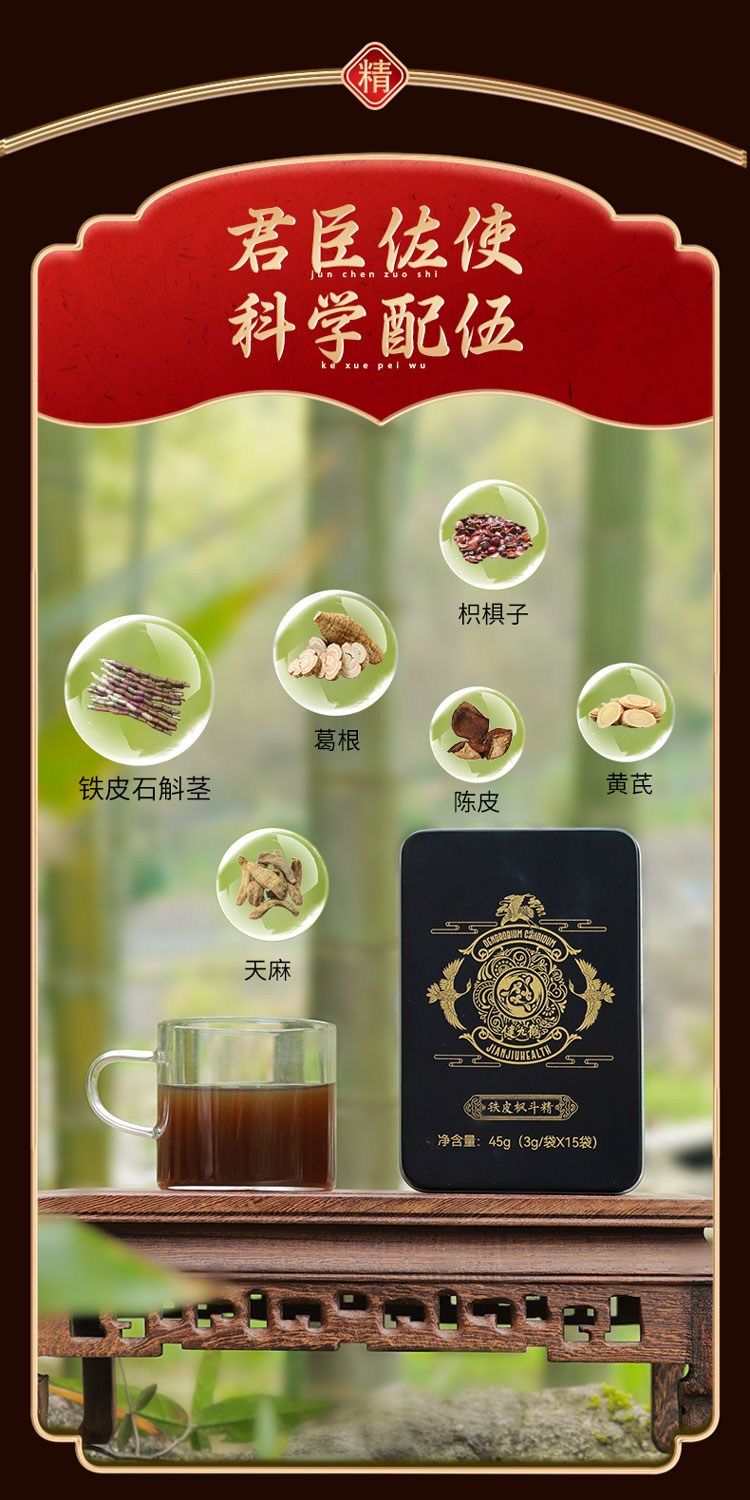 配伍:铁皮石斛花、葛根、黄芪、枳椇子、天麻、陈皮、罗汉果甜苷