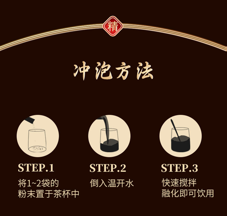 食用方法:每次1~2袋,每日2~3次。温开水冲服。婴幼儿、儿童、孕期及哺乳期妇女不宜食用