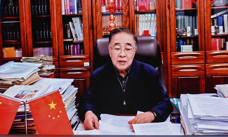 图为国家中药材标准化与质量评估创新联盟理事长张伯礼代表主办方视频致辞