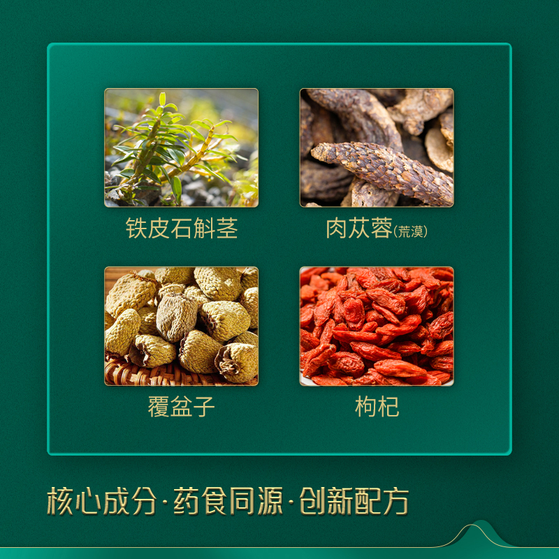 配料:铁皮石斛茎(30%)、肉苁蓉(荒漠)、覆盆子、枸杞、低聚果糖